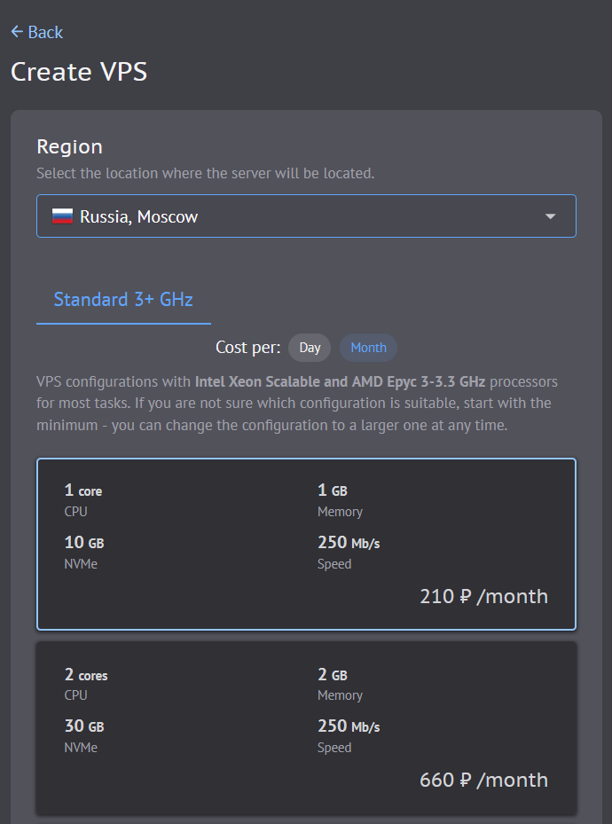 Для нашего проекта хватит минимальной конфигурации: 1 ядро, 1 ГБ памяти, 10 ГБ диска. Это стоит примерно 200 руб/мес.